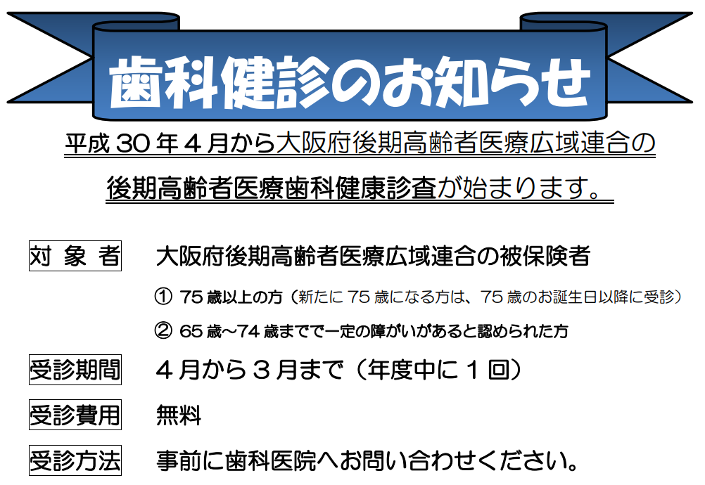 大阪府および吹田市の歯科健診について。当院は吹田市歯科医師会に入会していますので各種歯科健診を安心して受けてもらえます。そして、大阪府後期高齢者歯科健診の目的は高齢に伴う飲み込む機能低下を予防するための「お口のパタカラ体操」の重要性を知って頂くことです。※当院では各種歯科健診を毎年500名以上の方が受診されています。