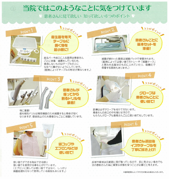 感染対策 感染対策は安心してください。卒後はすぐに口腔外科に勤務していたので外科系の清潔不潔の教育を若い頃からたたきこまれました。手袋はすぐに交換。すべてのものを滅菌しています。スタッフの子供も安心してメンテナンスに来ています。医療の基本であり、どんな技術よりもこの気持ちと姿勢と行動が大切です。吹田市|豊津駅|歯医者|出口町|片山町|垂水町|泉町|円山町|山手町|感染対策| ホーム